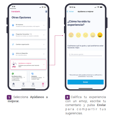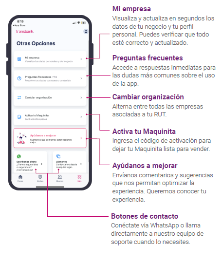 En la sección “Más” de tu App Transbank podrás acceder a opciones complementarias que te ayudan a personalizar tu experiencia y resolver tus dudas.
